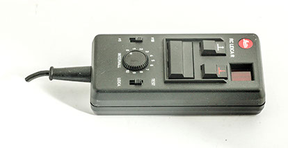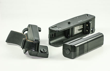 Components of the Leica R3 (right) motor drive: The motor housing, the battery pack, hand grip (above), and emote release (below).