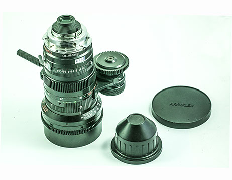 This lens was originally designed for Arri SR 16 mm format. It was modified by adding an element on the back to increase its coverage to Super 16 format. The image quality is still there but the added lens causes extreme pincushion distortion at its wide angle range. The T-stop is also increased from its original T2 to T2.5. The adjustable friction attachment engaged with the zoom ring helps the cameraman to perform smooth hand operated zooms. The optomechanix in this lens is so well done.